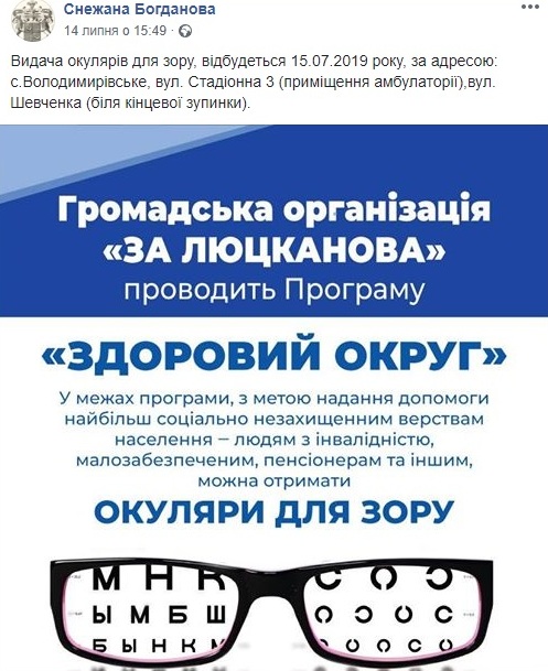 Тривають випадки безкоштовного розповсюдження окулярів на підтримку кандидата Володимира Люцканова. Староста селищної громади Володимирівського Снежана Богданова, яка раніше висловлювала публічну подяку цьому висуванцю з 82-го одномандатного виборчого округу за куплену для потреб села мотокосу, 15 липня проанонсувала акцію з роздачі окулярів. Нагадуємо, що поліція не встановила в таких діях ознак підкупу виборців, оскільки вартість подарунків не перевищувала допустиму ціну.