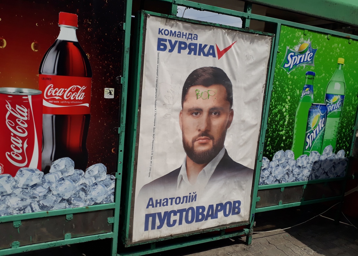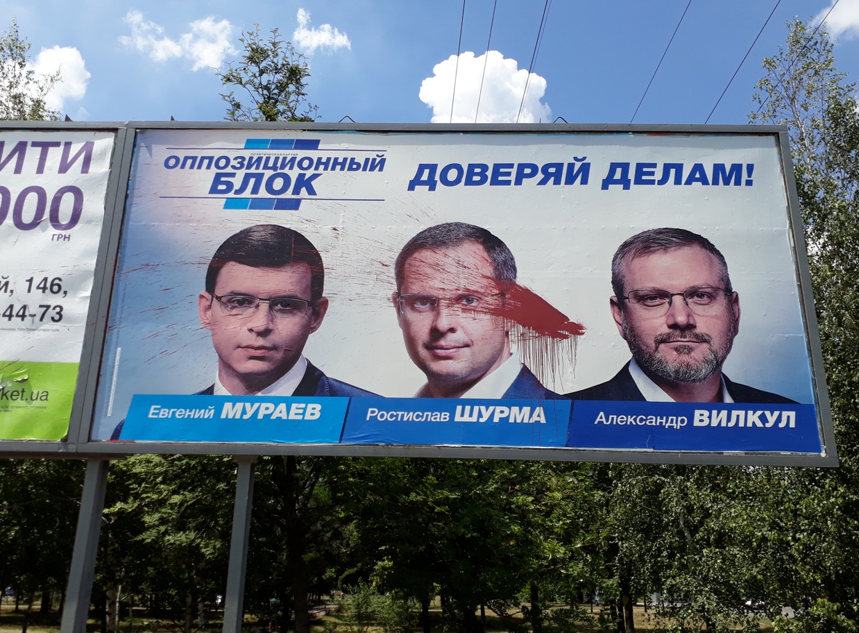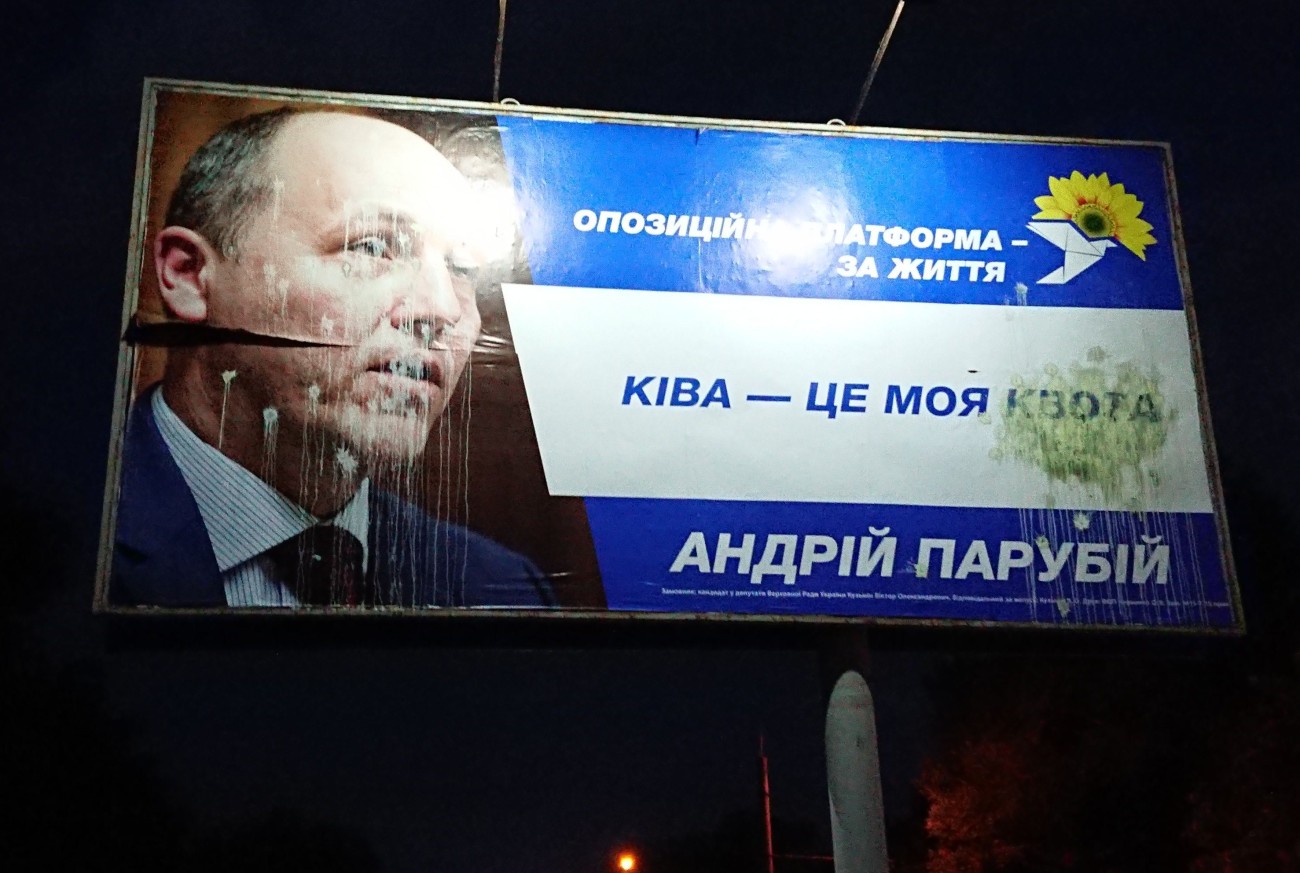 Помічені зіпсовані зразки зовнішньої агітації за Андрія Парубія та представників партії «Опозиційний блок»: Ростислава Шурму й «команду Буряка» (спільна самоназва трьох кандидатів-мажоритарників Віктора Буська, Анатолія Пустоварова, Ігоря Чумаченка та Володимира Буряка, який йде під номером 8 у виборчих списках партії «Опозиційний блок»).