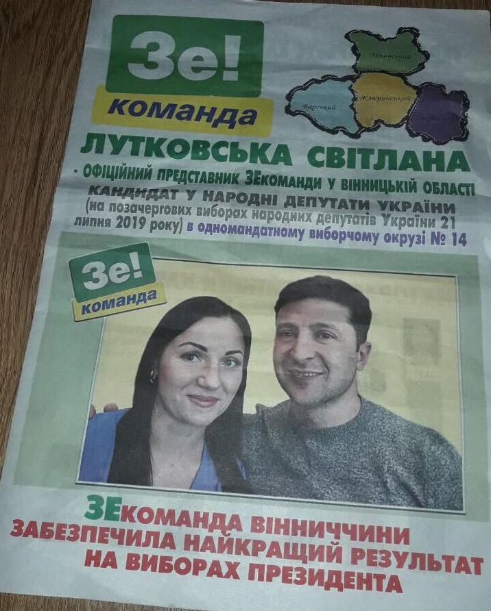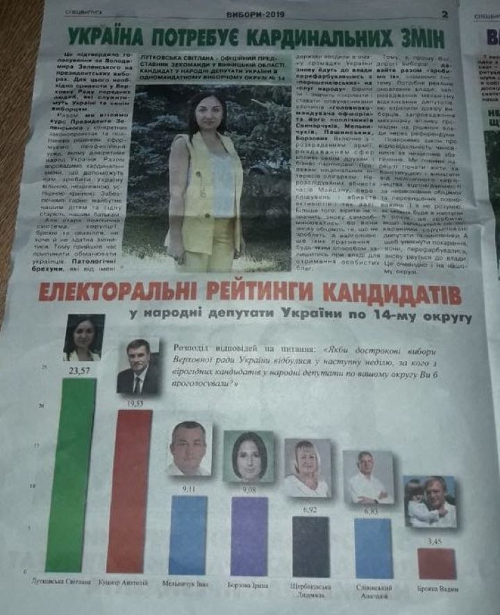 Так, 18 липня в окрузі №14 (центр – місто Жмеринка) розповсюджувалася газета, на першій сторінці якої написано «ЗЕ!Команда. Світлана Лутковська – офіційний представник Зекоманди у Вінницькій області». На другій сторінці у газеті надруковано «електоральні рейтинги кандидатів». Згідно з ними, найвищі шанси пройти до Верховної Ради України у кандидатки в народні депутати по виборчому округу №14 Світлани Лутковської (самовисування). У дослідженні не вказується жодних відомостей про його проведення.