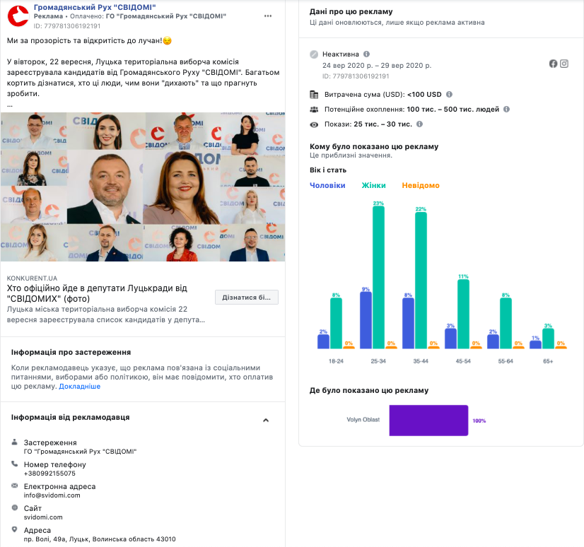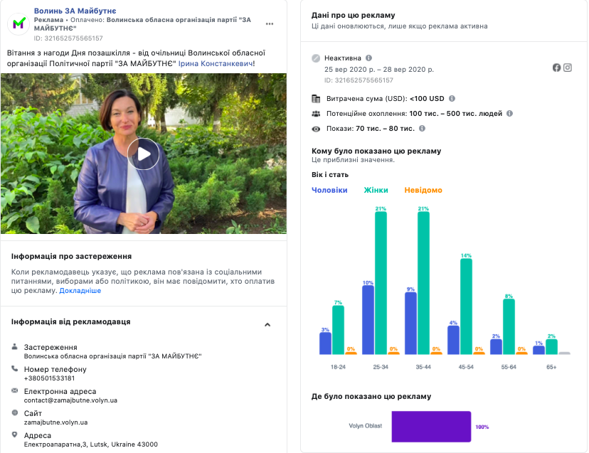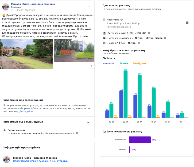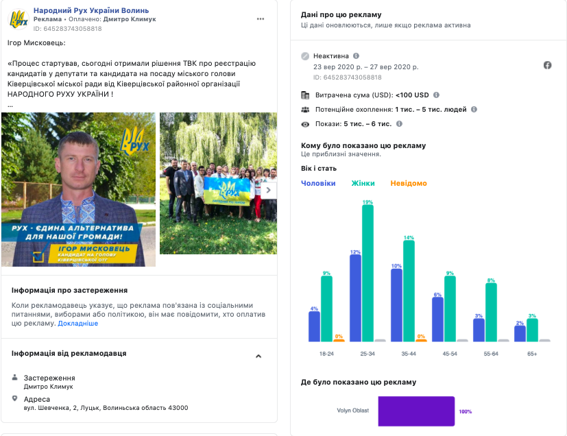 Зі сторінки «Народний Рух України Волинь» у мережі Facebook вмикалося на рекламу протягом вересня 4 повідомлення. Одне з них стосувалось кандидата на посаду Ківерцівського міського голови Ігоря Мисковця, ще два – були присвячені кандидатам у депутати Луцької міської ради Дмитра Климука і Наталії Грушки. Всі повідомлення транслювалися із застереженням і оплатив їх «Дмитро Климук».