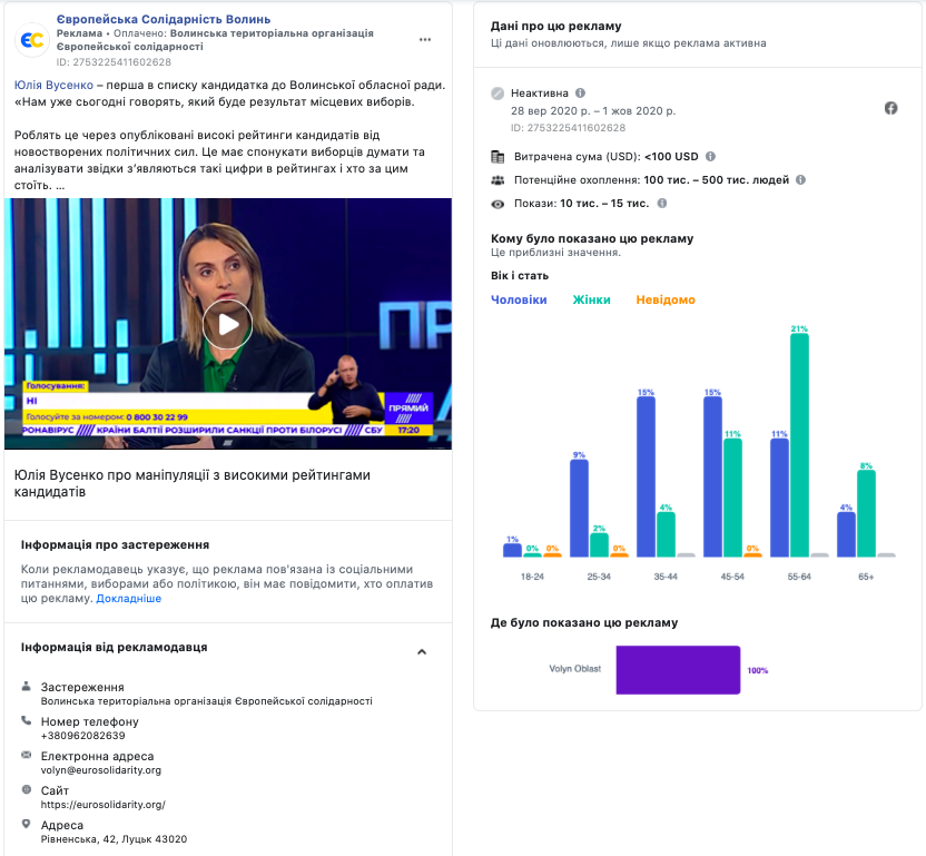 На сторінці «Європейська Солідарність Волинь» у мережі Facebook було виявлено 11 рекламних повідомлень, які транслювались із застереженням протягом вересня 2020 року. На сторінці переважно рекламували кандидатку до Волинської обласної ради Юлію Вусенко, кандидата на посаду Луцького міського голови Юрія Моклицю та інших кандидатів до рад різних рівнів, зокрема, Артема Запотоцького, Олександра Паровенка, Галину Поліщук, Віталія Сніжка, Ірину Патлашинську. Усю рекламу оплатила Волинська територіальна організація «Європейської солідарності».