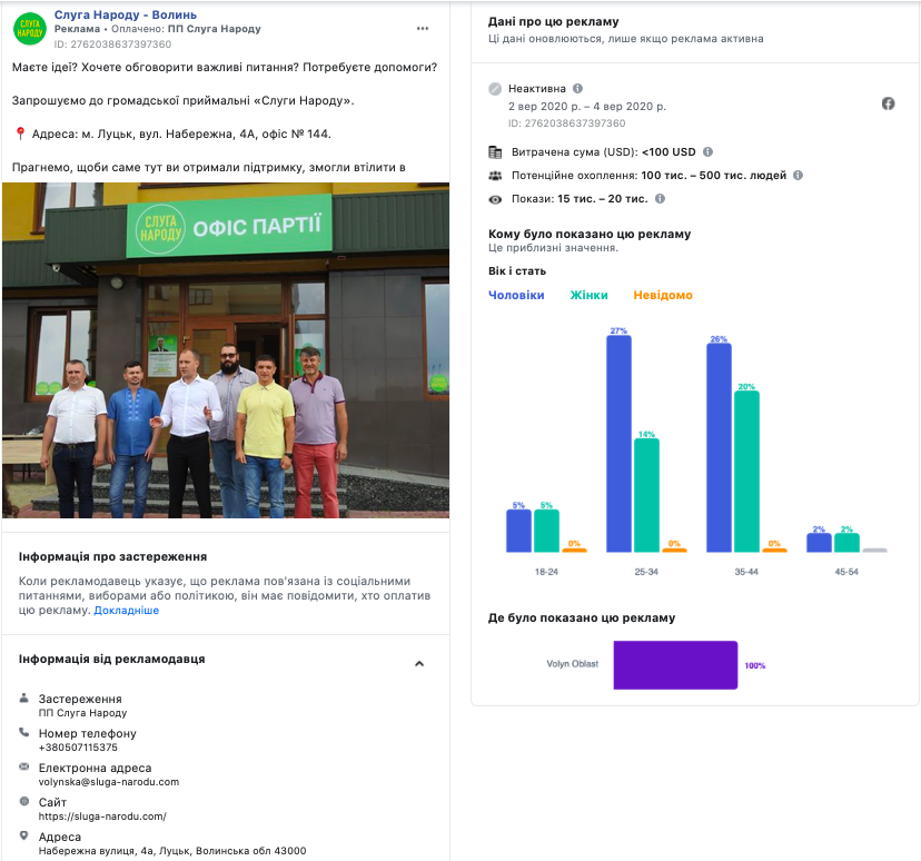 На сторінці «Слуга народу – Волинь» у мережі Facebook протягом вересня було виявлено 10 рекламних повідомлень, більша частина з яких вмикалися на рекламу двічі. Реклама транслювалася з застереженням і була оплачена «ПП Слуга народу». Рекламували на сторінці партосередку переважно дописи, які висвітлювали позицію партії щодо суспільно важливих тем (підвищення мінімальної заробітної плати, навчання під час карантину, реєстрація домашніх тварин, декретна відпустка для чоловіків тощо). Разом із тим, один допис стосувався роботи партійної приймальні у Луцьку, а також кандидата у депутати Луцької міської ради Андрія Костенка.
