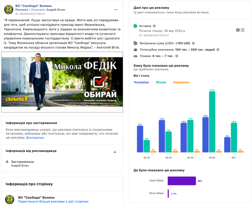 На сторінці «ВО Свобода Волинь» у вересні вмикали на рекламу 4 публікації. Усі рекламні повідомлення транслювались із застереженням. Оплатив рекламу «Андрій Білан». Серед чотирьох публікацій одна стосувалась кандидата на посаду Луцького міського голови Миколи Федіка.