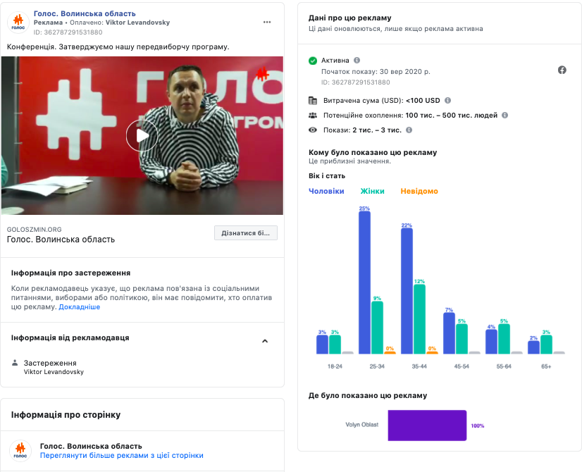 На сторінці «Голос. Волинська область» у мережі Facebook було опубліковано протягом вересня 3 рекламні повідомлення, одне з яких транслювалося двічі. Всі рекламні публікації зі сторінки оплатив «Viktor Levandovsky». Останнє опубліковане повідомлення стосувалось партійної конференції «Голосу». Ще три публікації вмикалися на рекламу зі сторінки «Віктор Левандовський» - кандидата у депутати від політичної партії «Голос».