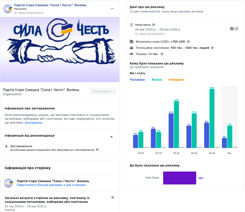 Лише одне рекламне повідомлення було виявлено на сторінці «Партія Ігоря Смешка «Сила і Честь». Волинь». Реклама демонструвалася з 28 вересня без застереження і, відповідно, невідомо, ким була оплачена. Єдиний та територіальні списки кандидатів у депутати Луцької міської ради політичної партії «Сила і Честь» зареєструвала Луцька міська ТВК відповідно до постанови №29 від 24 вересня 2020 року.