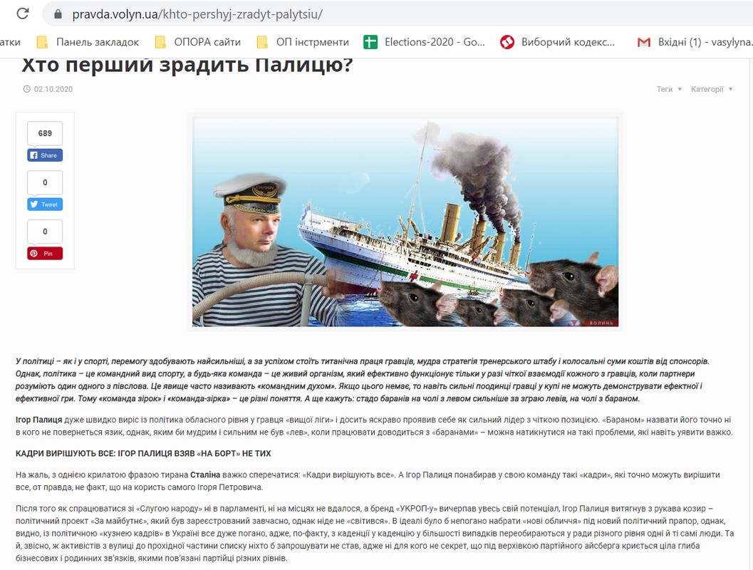 Дві негативні публікації – на «Волинській правді» та сайті «Лучеськ» – пов’язані із Ігорем Палицею. Безпосередньої критики власне політика немає, проте його партію називають «проектом», а також активно критикуючи нардепів Ігоря Гузя та Степана Івахіва, які потрапили у команду Ігоря Палиці, їх називають «підлабузниками», «перебіжчиками» тощо.