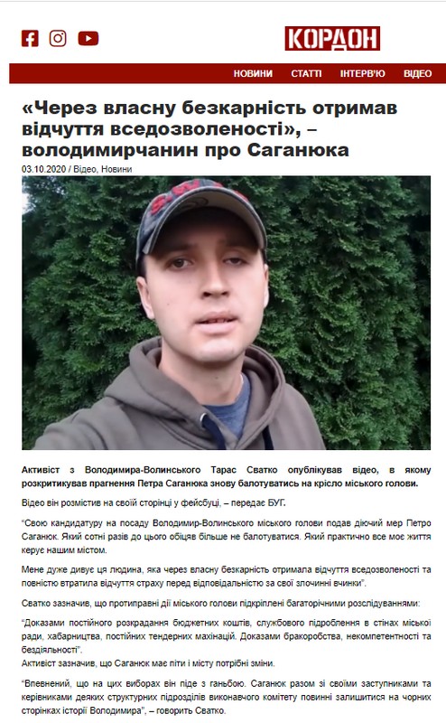 Одна публікація на сторінках видання «Кордон» стосувалася чинного міського голови Володимира-Волинського та кандидата на цю ж посаду Петра Саганюка (самовисування). Йдеться про матеріал із відео місцевого активіста Тараса Сватка, у котрому він критикує намір кандидата балотуватися.