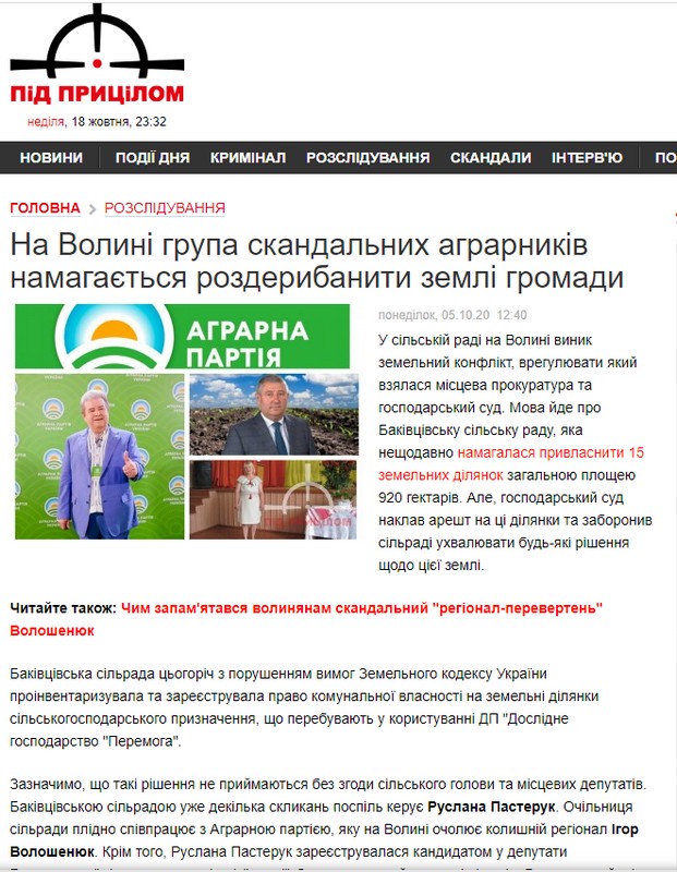 Ще одна публікація на сторінках «Під прицілом» висвітлювала у негативному ключі кандидатів від Аграрної партії України. Їх у публікації звинувачують у причетності до схем нечесного розподілу земель. Зауважимо, що видання згодом ще раз помістило цю публікацію у денному дайджесті найважливіших новин, який вийшов наступного дня після публікації.
