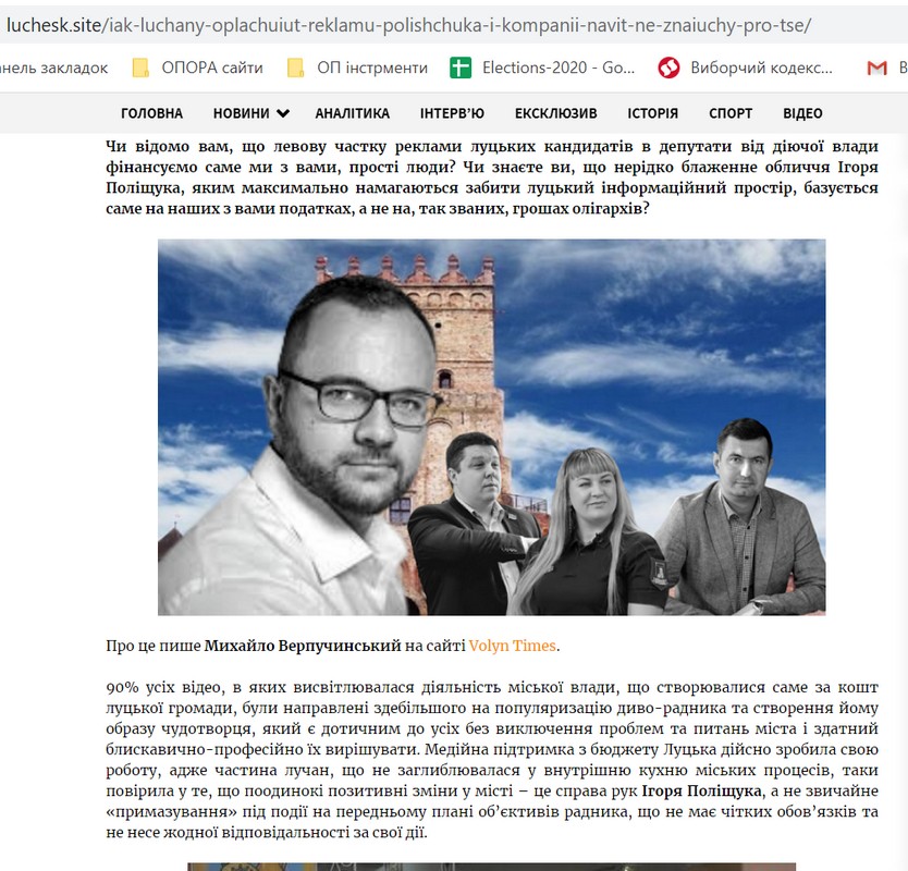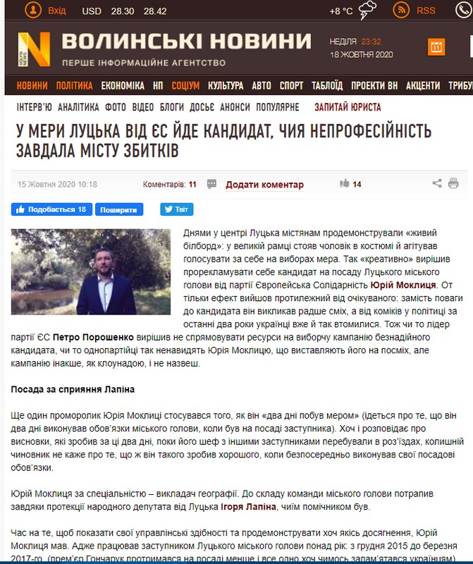 Ще дві публікації критикували кандидата на посаду міського голови Луцька Юрія Моклицю («Європейська Солідарність»). Тут розповідають про «провали» кандидата, коли він був на посаді заступника міського голови, акцентуючи увагу лише на негативних моментах, розповідаючи про нібито шалені збитки від роботи.