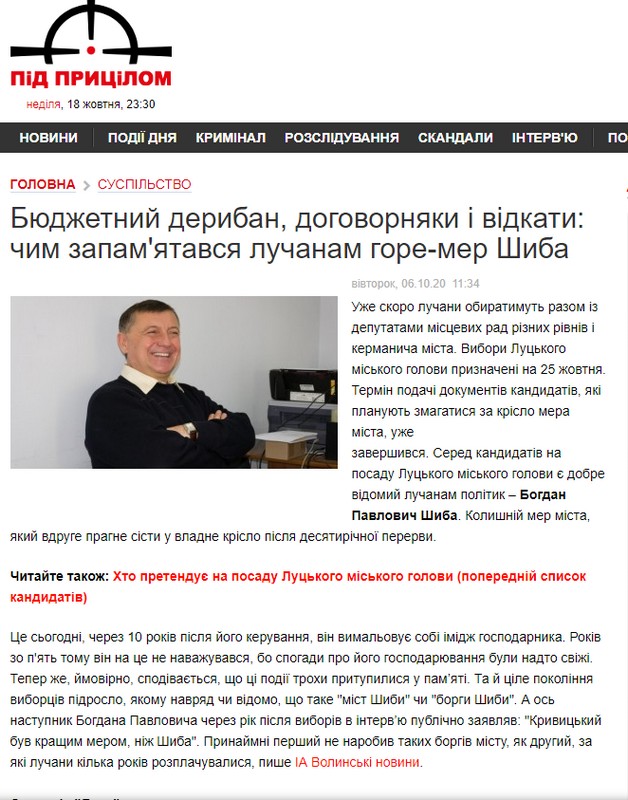 Ще 9 публікацій негативного змісту стосувалися кандидата-самовисуванця на посаду Луцького міського голови Богдана Шиби. Більшість статей акцентували увагу на тому, що Богдан Шиба уже очолював місто та писали про «перевищення повноважень», «земельні махінації» та те, як Богдан Шиба «загнав Луцьк у боргову яму». Ще дві публікації розповідали про аварію 14-річної давності, учасником якої був Богдан Шиба.