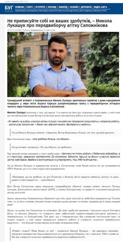 Три аналогічні публікації, спрямовані на критику політики кандидата-самовисуванця на посаду міського голови Нововолинська, який і нині займає цю посаду, Віктора Сапожнікова, виявили в онлайн-ресурсах. У публікаціях посилаються на слова активіста Миколи Лукашука, котрий негативно висловлюється щодо звіту Віктора Сапожнікова як міського голови, котрий був опублікований у газеті. Матеріали вийшли у виданнях «Кордон», «Буг», «Нововолинський інформаційний портал».