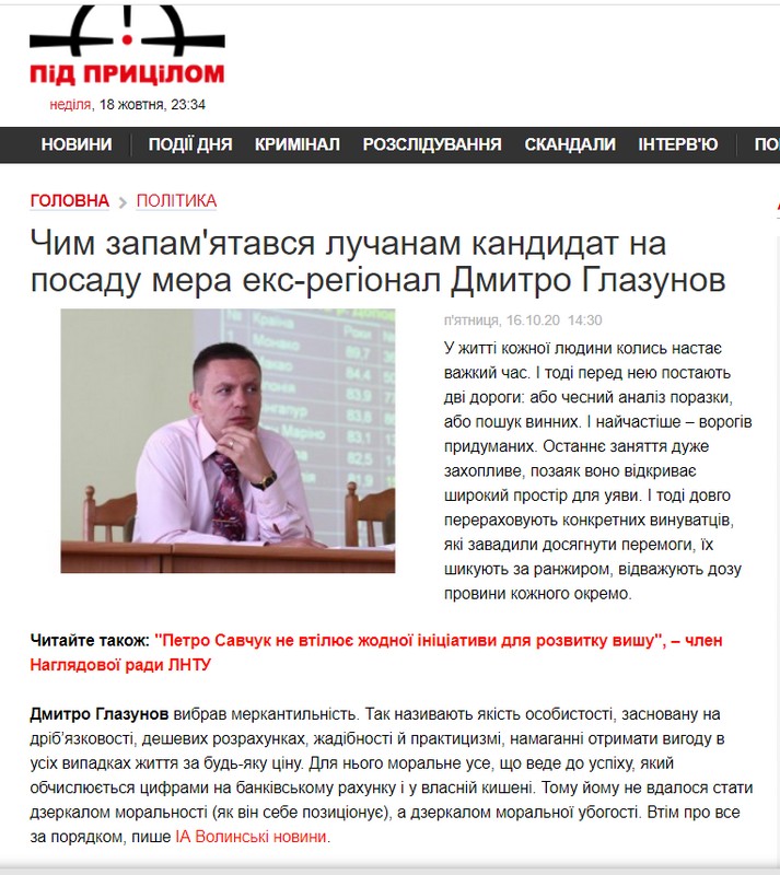 Дві публікації стосувалися самовисуванця на посаду Луцького міського голови Дмитра Глазунова, котрі вийшли на «Волинських новинах» та «Під прицілом». У публікації йдеться про «непрофесійність та меркантильність» кандидата тощо.