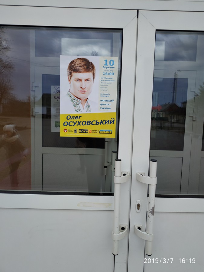 Першим із особистим візитом у березні на Волинь завітав Руслан Кошулинський. 3 березня кандидат відвідав два населені пункти – міста Горохів та Луцьк. У Горохові Кошулинський зустрівся із громадою у приміщенні Центральної районної бібліотеки, а у Луцьку – в актовій залі «Просвіти». Зауважимо, що анонс про візит кандидата у Горохові прикріпили тут-таки, у вікні комунальної установи, про що ОПОРА вже повідомляла.
