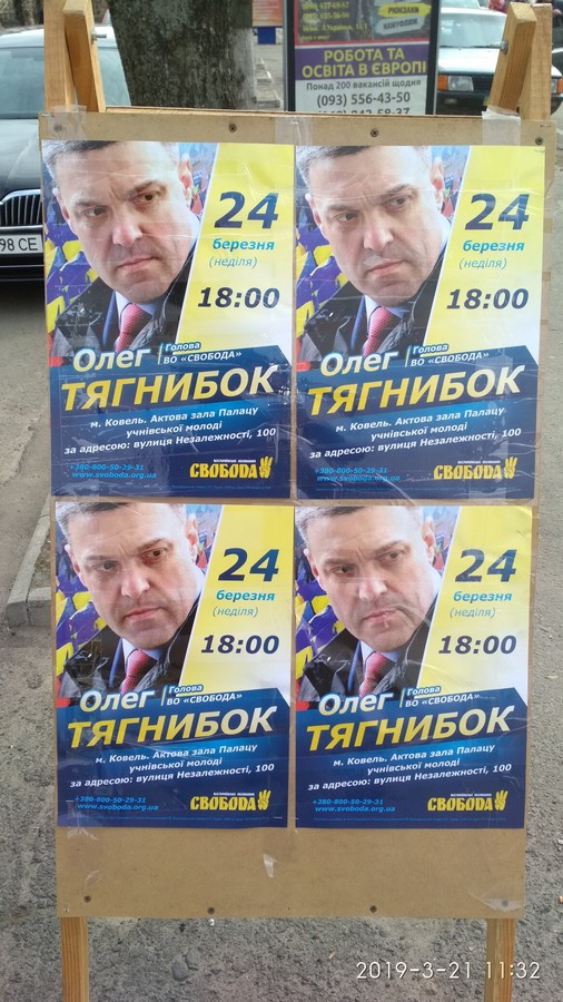 Також 24 березня на Волині побував лідер політичної партії ВО «Свобода» Олег Тягнибок. Він провів зустріч з виборцями у м. Ковель в актовій залі Палацу учнівської молоді. Його візит та зустрічі з виборцями відбулися на підтримку кандидата у Президенти Руслана Кошулинського.