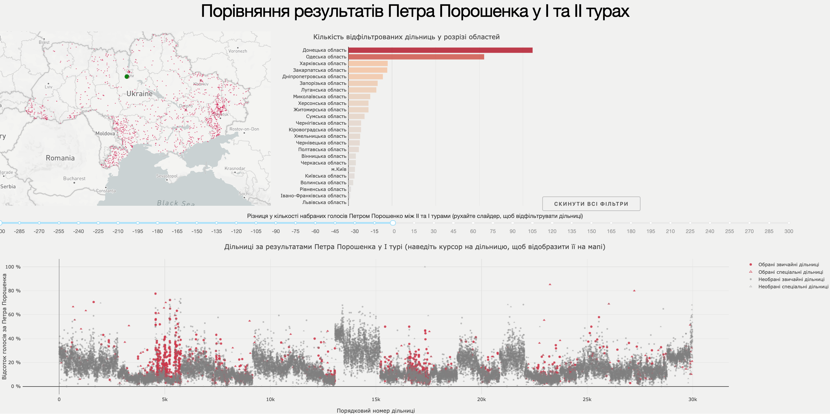 Для того, щоб детальніше дослідити цю аномалію, ми створили прилад для порівняння голосів Петра Порошенка в І та ІІ турах. В основі інструменту – дані різниці кількості отриманих голосів Петром Порошенком між ІІ та І турами. Встановлюючи діапазон кількості втрачених/отриманих голосів Петра Порошенка можна візуалізувати дані та самостійно знаходити та досліджувати аномальні дільниці.