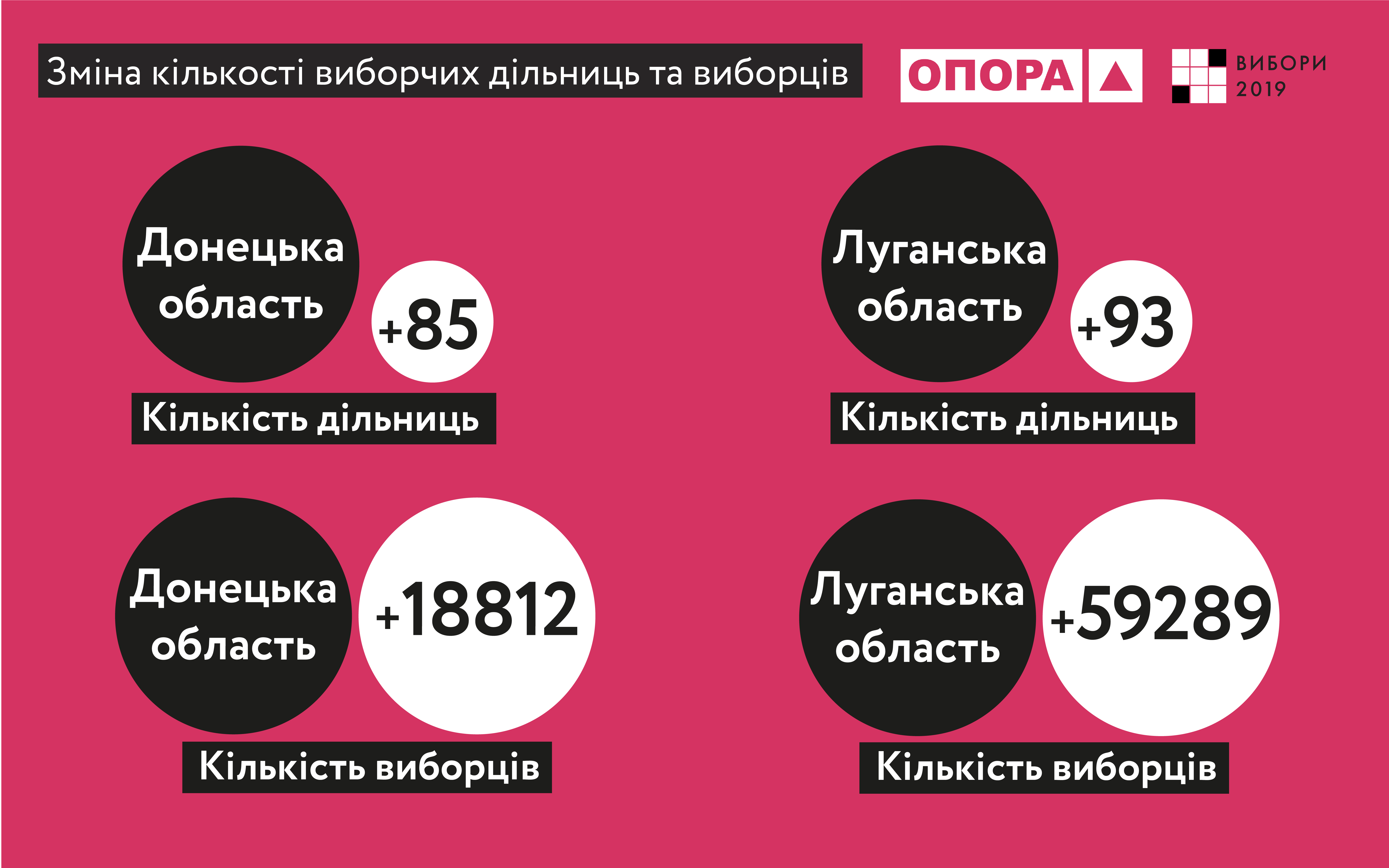 На території двох областей кількість таких дільниць збільшилась на 178 (Донецька обл. - 85 ВД, Луганська обл. - 93). Натомість загальна кількість виборців на підконтрольній частині Донецької області збільшилась на майже 19 тис. виборців у порівнянні із парламентськими виборами 2014 р. У Луганській області така кількість виборців зросла на 59 тис. громадян (за даними офіційного веб-сайту ЦВК).