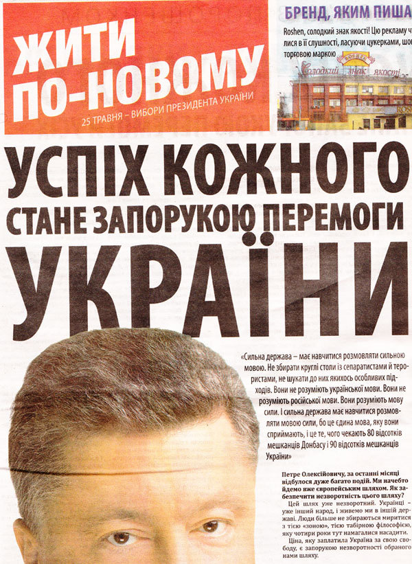 Основним меседжем Петра Порошенка на президентських виборах 2014 року було гасло “Жити по-новому”. Інша ідея – безальтернативність щодо інших кандидатів, яка втілювалася в концепті “Обери мир – обери Порошенка”. Ставка робилась на унікальне позиціонування образ "нового політика". Також його позиціонували як прихильна змін, до яких прагнуло суспільство. У команді Петра Порошенка Ігор Гринів відповідав за стратегічні розробки й загальну логіку діяльності кандидата в президенти. Юрій Стець відповідав за медійну складову кампанії, ефективність комунікації та реалізацію стратегії. Медіапланування та контроль за якістю робіт були в зоні відповідальності Альони Матузко. Сергій Березенко відповідав за побудову в надзвичайно короткі строки "поля" – локальні структури, мережу, запуск агітаційних проєктів у регіони. Нарешті, Ірина Фріз відповідала за PR, комунікацію зі ЗМІ та експертами. Поки інші політики акцентували увагу на силі, обороні, патріотизмі, злагоді, кандидат Порошенко говорив про те, що всі ці моменти важливі, але лише тоді, коли вони будуть новими. Саме цей ключовий атрибут об'єднав різні соціальні групи. Кандидат Порошенко намагався жодним чином не піддаватися на провокації, не вступати в суперечки й не займатися чорним піаром, щоб уникнути асоціації з минулим. Він не взяв участь у дебатах із Юлією Тимошенко, адже вся риторика конкурентки говорила про те, що Порошенку будуть нав'язувати суперечку про минуле. А це аж ніяк не відповідало стратегії позиціонування, іміджеві втрати були б більшими, ніж через неучасть у дебатах. Політична реклама Порошенка у квітні-травні 2014 року була досить "аскетичною". В його рекламі був використаний червоний колір як символ активних дій. Фінальним акордом кампанії стала джинса, яка була поширена у різних ЗМІ із однаковою назвою "Петро Порошенко стане Президентом ще в першому турі виборів".