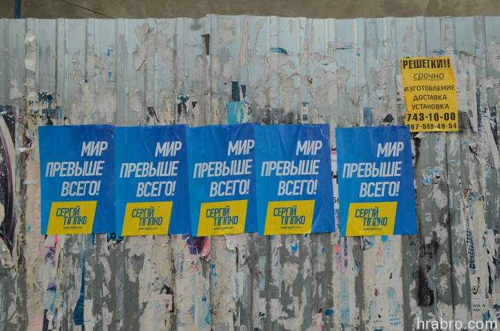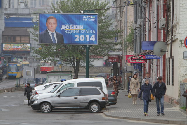 Михайло Добкін звертався до виборців із білбордів з гаслом "Єдина країна". Кольорова гама білбордів була синьо-білою (схожа до кампанії Януковича). Його зовнішню агітацію всіляко псували.