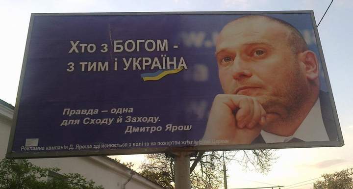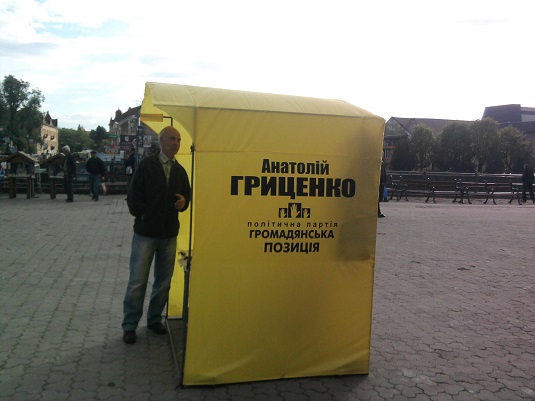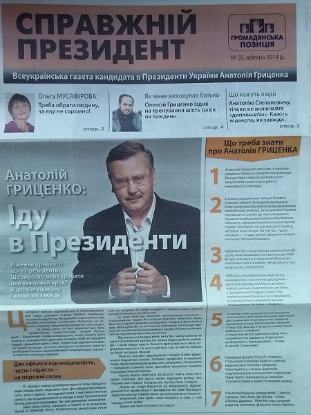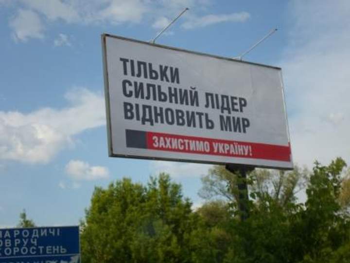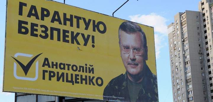Колишній Міністр оборони України Анатолій Гриценко у камуфляжі запевняв з білбордів, що "Україна буде в безпеці", якщо він стане президентом.