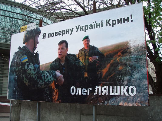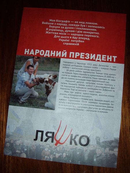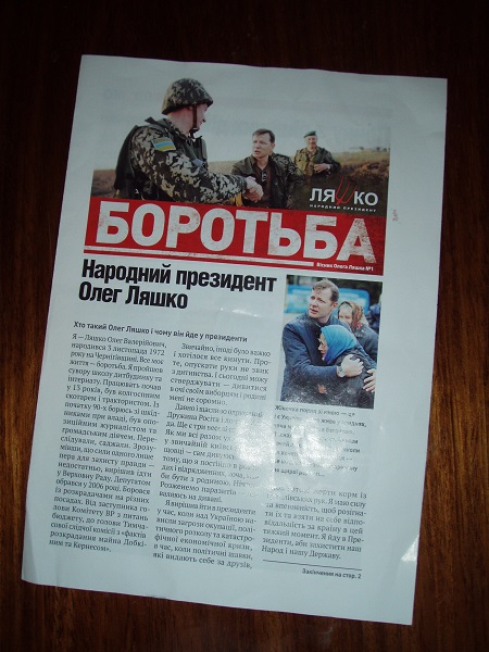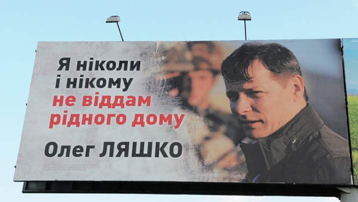 Найактивнішим на старті у безпосередній роботі з виборцями був Олег Ляшко. Його команда організовувала публічні акції, а зовнішня реклама кандидата (із лозунгом «Смерть окупантам») чи не першою з’явилася на вулицях населених пунктів України. Лідер Радикальної партії вирішив зіграти на почуттях того електорату, який був проти агресії Росії. З вилами у вишиванці та в руках він обіцяв розігнати всіх корупціонерів в Україні. Активно використовувалася військова тематика.