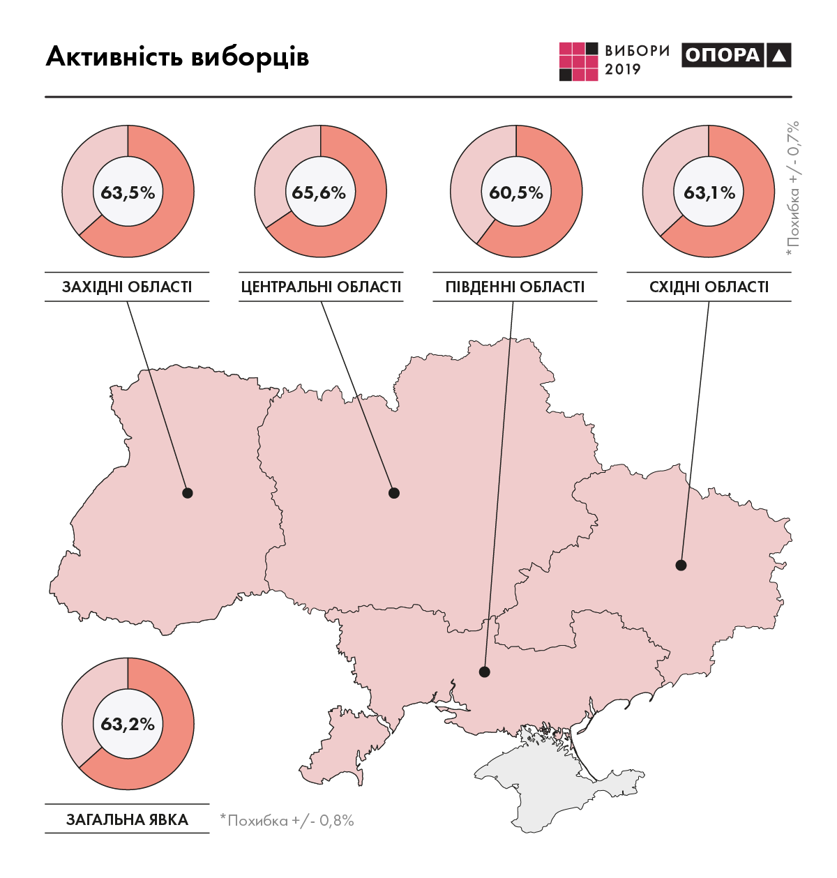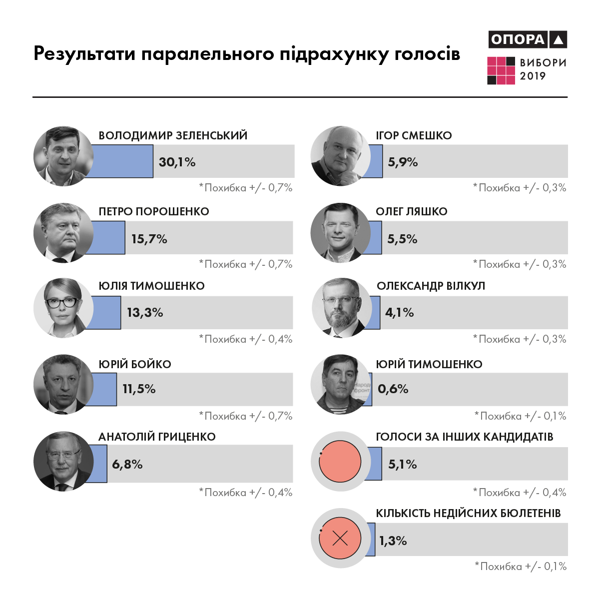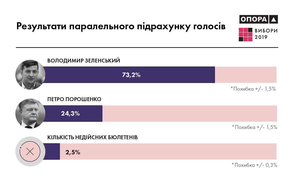 Паралельний підрахунок голосів виборців, який провела ОПОРОЮ, показав перемогу кандидата на пост Президента України Володимира Зеленського за результатами повторного голосування та його ж електоральну перевагу під час першого туру виборів. Співпала з даними ЦВК і обрахована ОПОРОЮ активність виборців, яка під час першого та другого турів голосування становила 63,2% та 61,6% відповідно.