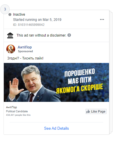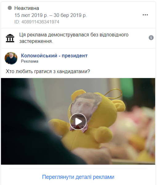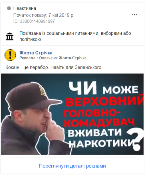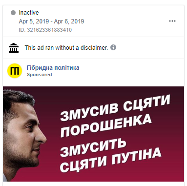 Уся політична реклама на цих сторінках була оплачена однойменною громадською організацією «Команда Зеленського» (код ЄДРПОУ — 42892769), яка була заснована 18 березня 2019 року Михайлом Федоровим. Він був куратором Інтернет-кампанії Володимира Зеленського, а після обрання Зеленського став його радником з digital-напряму. Якщо поглянути на остаточний фінансовий звіт Володимира Зеленського на сайті НАЗК, то безпосередньо на рекламу в Інтернеті кандидат витратив 259 197 грн двома платежами ТОВ «МЕГОГО». Однак орієнтовна вартість політичної реклами у Facebook, яка була оплачена ГО «Команда Зеленського», становить від 934 000 до 9 227 000 грн, що як мінімум у три рази більше суми вказаної в офіційному фінансовому звіті кандидата. Окрім цього, не дивлячись на те, що Закон України «Про вибори Президента України» прямо забороняє агітацію з 24 години останньої п’ятниці, що передує дню виборів чи дню повторного голосування (ч. 17, ст. 64), на сторінці «Команда Зеленського» з 30 по 31 березня на сторінці було опубліковано 168 рекламних публікацій, а з 20 по 21 квітня – 1170 публікацій.
