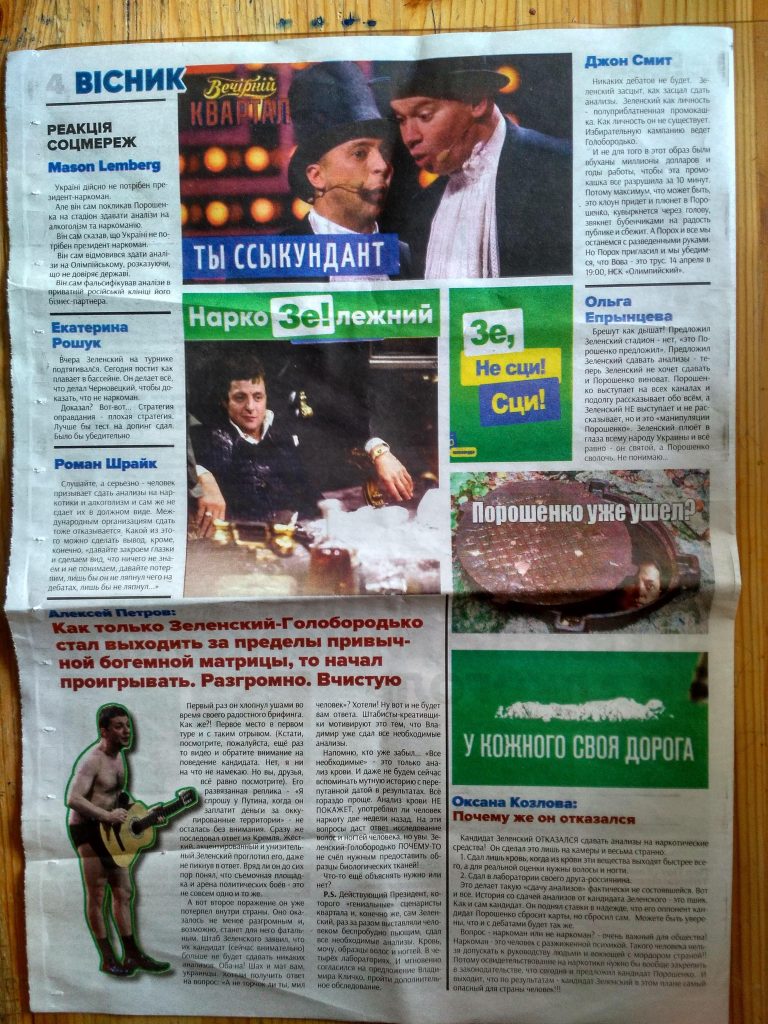 Агітаційна кампанія Володимира Зеленського була так само масштабною, але не включала вуличні заходи та розповсюдження друкованих матеріалів. Вище ми вже згадували про участь кандидата в гастрольному турне творчої студії «Квартал 95», а також трансляцію серіалу «Слуга народу» на загальнонаціональному каналі. До речі, на тому ж каналі Зеленський у перший день виборчого процесу оголосив про свій намір взяти участь у виборах. Телеканал «1+1» пустив привітання Зеленського до Нового Року в час, коли традиційно на телеканалах транслюють привітання від президента. Привітання голови держави Петра Порошенка на каналі пустили вже після опівночі. «Зробимо їх разом», «Весна покаже, хто де крав», «Весна прийде ― саджати будемо» і «Все буде Зе!шибісь!» - такими гаслами супроводжувалися агітаційні матеріали Володимира Зеленського. А от у березні вони змінились на нові: «Ні обіцянок, ні пробачень. Зе!Президент ― слуга народу» і «Здай корупціонера ― отримай 10%. Зе!Президент ― слуга народу».