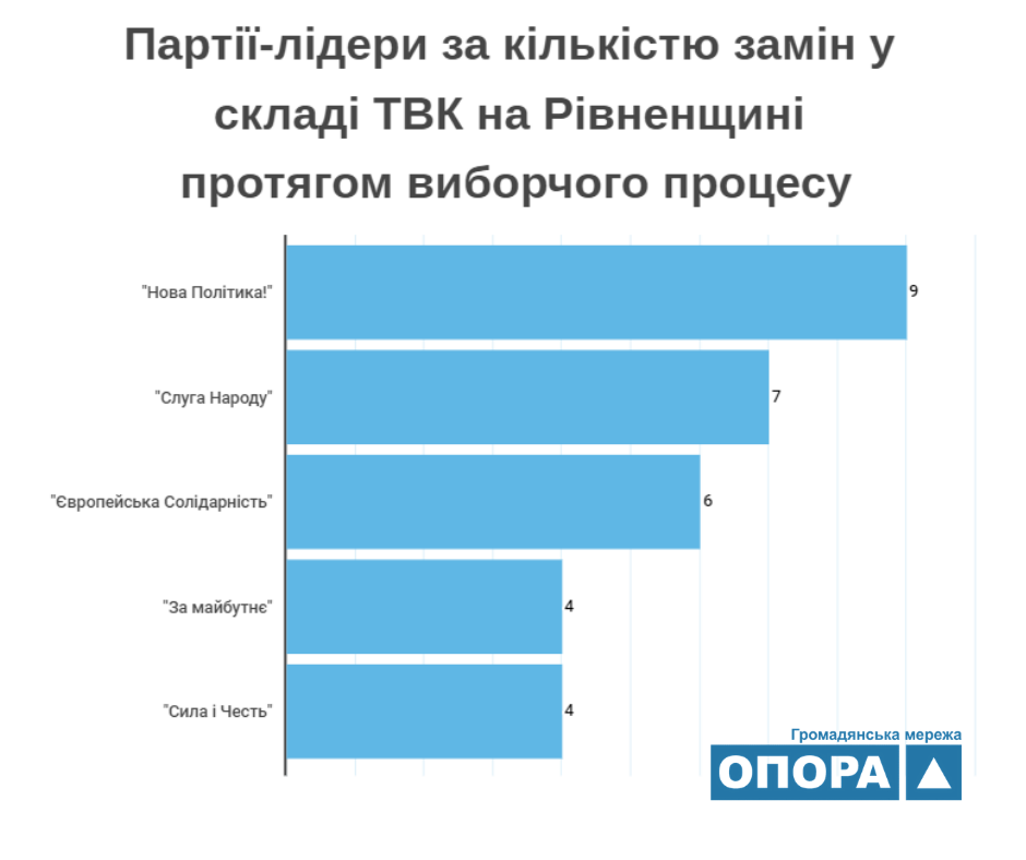 Лідером за кількістю здійснених замін членів комісії протягом виборчого процесу стала партія - «Нова Політика» – 9 замін. Далі – партії «Слуга Народу» (7 замін) та «Європейська Солідарність» (6 замін).