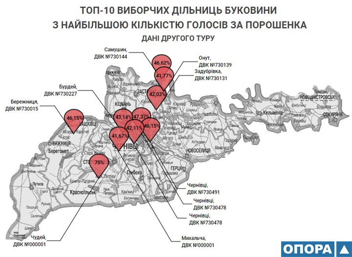 Найбільший приріст голосів у другому турі Петро Порошенко також отримав на спеціальних дільницях – Обласній дитячій клінічній лікарні (+29,51%) та Обласному ендокринологічному центрі (+26,39%) у Чернівцях. Серед звичайних виборчих дільниць найвищий приріст голосів за кандидата був зафіксований в с. Бурдей Кіцманського району – 25,14%. На 5 виборчих дільницях, де у другому турі Петро Порошенко отримав одні з найбільших результатів в області (більше 40% голосів), у першому турі за нього було подано не більше 23% .