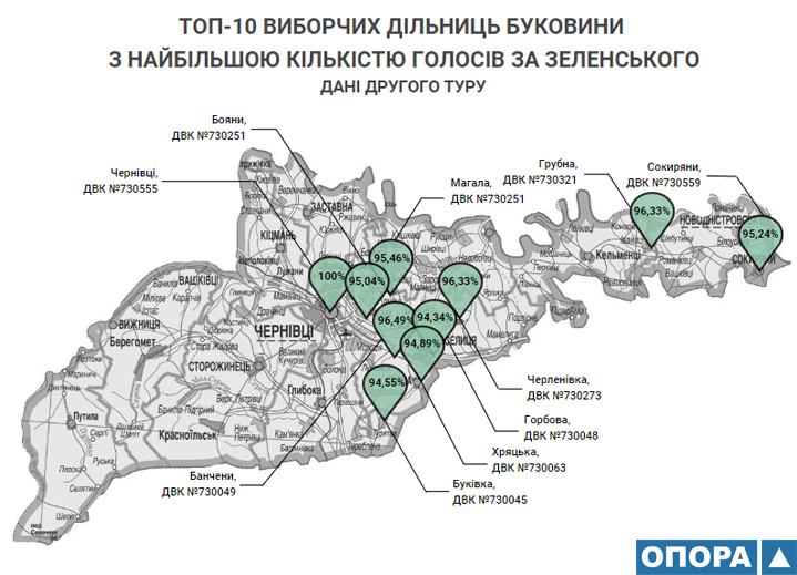 З-поміж десяти виборчих дільниць з найбільшим приростом голосів за Володимира Зеленського у другому турі вже представлені всі округи Чернівецької області. Найбільше серед них з 202-го та 204-го виборчого округу – по 4 дільниці. На трьох дільницях, де у другому турі Володимир Зеленський набрав більше 95% голосів, у першому турі за нього було подано не більше 25,5%.