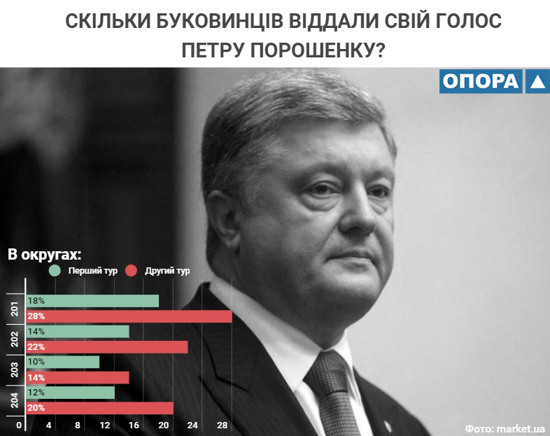 Петро Порошенко справився з цим завданням не так успішно. Найбільш активно виборці проявили своє бажання проголосувати за цього кандидата у ВО №201. Як і у Володимира Зеленського, так і в Петра Порошенка приріст електорату на округах №202 та №204 майже однаковий. В обох округах кандидат залучив +8% голосів. Найнижчий приріст зафіксований в окрузі №203, де 4% людей з правом голосу, які не голосували за Петра Порошенка у першому турі, вирішили підтримати його на другому етапі виборів.