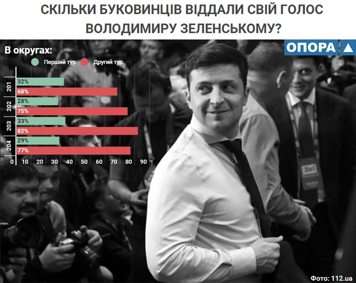 Серед чотирьох виборчих округів Буковини найбільшу підтримку як після першого, так і після другого туру виборів Володимир Зеленський отримав у румуномовних районах 203-го округу. Менш активно за цього кандидата виборці голосували у ВО №202 та ВО №204. 201-ий округ з центром у Чернівцях демонстрував майже найвищу підтримку Володимиру Зеленському у першому турі, однак після другого етапу виборів на цьому ВО кандидат отримав найменшу кількість голосів.