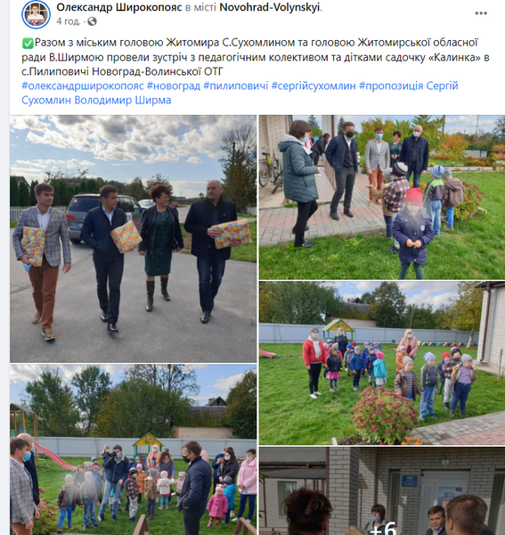 Інформацію про зустріч в садочку опублікував на своїй сторінці Олександр Широкопояс. “Разом з міським головою Житомира С.Сухомлином та головою Житомирської обласної ради В.Ширмою провели зустріч з педагогічним колективом та дітками садочку «Калинка» в с.Пилиповичі Новоград-Волинської ОТГ”, – йдеться у повідомленні.