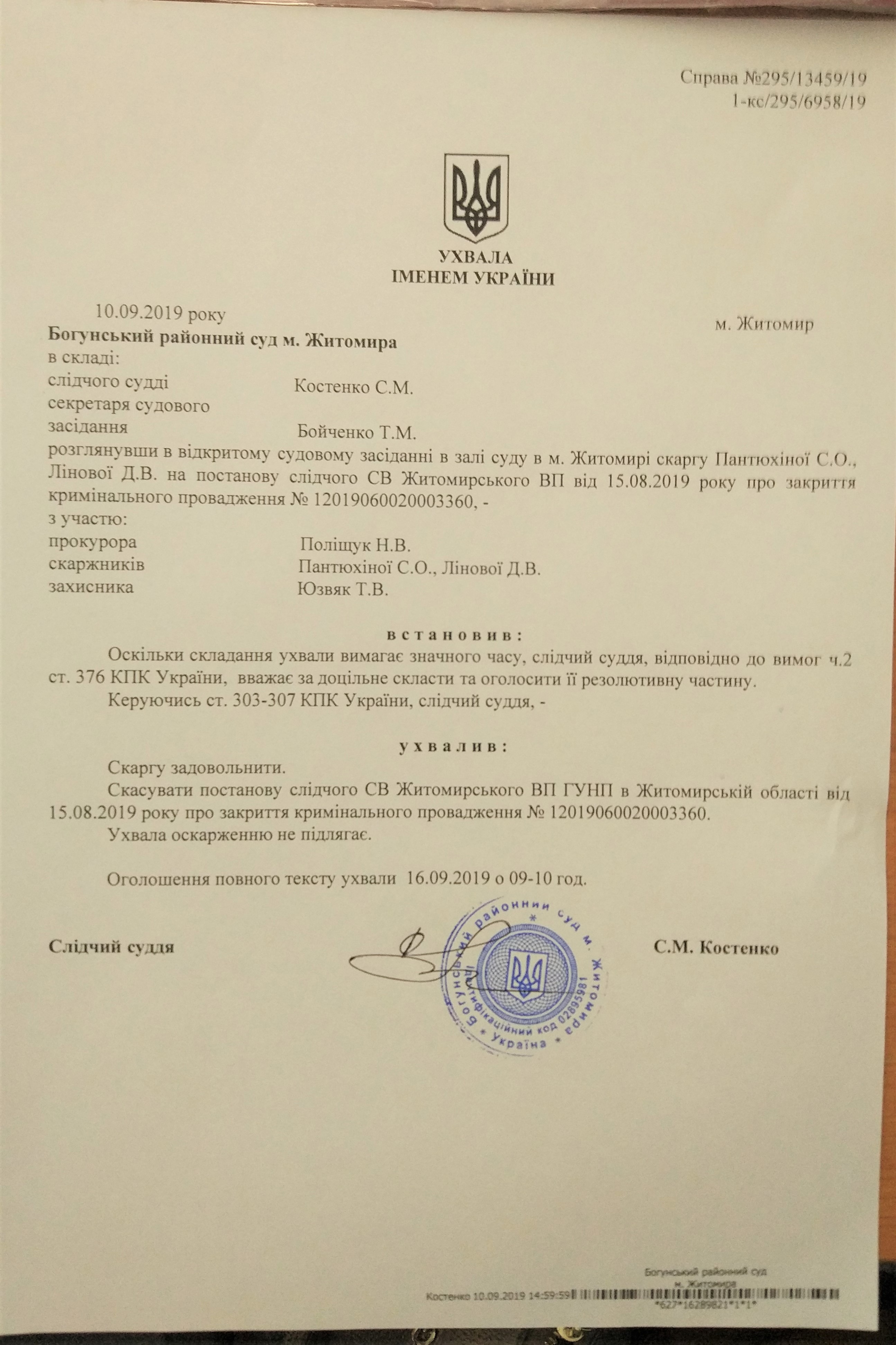 Ухвалою Богунського районного суду Житомира скаргу було задоволено та скасовано постанову слідчої про закриття кримінального провадження.