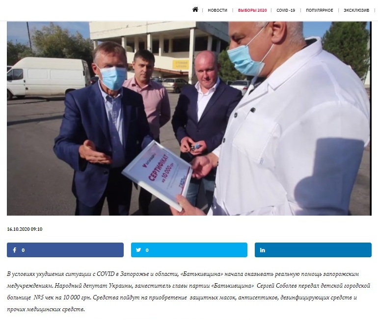 16 жовтня інформаційний портал «Акцент» повідомив, що народний депутат України, заступник голови партії ВО «Батьківщина» Сергій Соболєв передав Запорізькій дитячій міській лікарні №5 чек на 10 000 грн. Зазначається, що кошти мають піти на придбання захисних масок, антисептиків, дезінфікуючих засобів та інших медичних засобів. На світлині, що ілюструє публікацію окрім згаданого нардепа присутній голова Запорізького обласного осередку партії ВО «Батьківщина» Владислав Куценко.