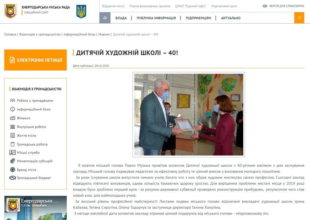 Офіційний сайт Енергодарської міської ради сповістив, що 9 жовтня міський голова Енергодара Павло Музика привітав колектив Дитячої художньої школи з ювілеєм. З такої нагоди співробітникам закладу надали в подарунок мікрохвильову піч. Громадський омбудсмен із захисту виборчих прав Громадянської мережі ОПОРА у Запорізькій області Денис Прядко спрямував запит до Енергодарської міськради із проханням надати роз’яснення, за які кошти придбали цей подарунок.