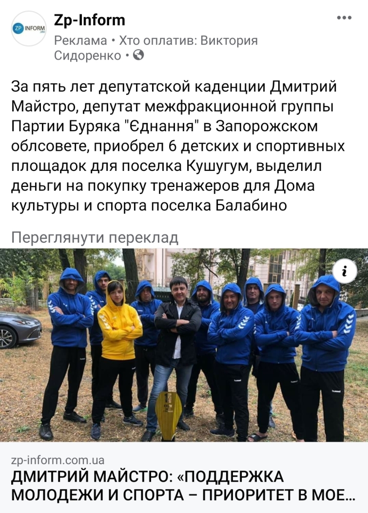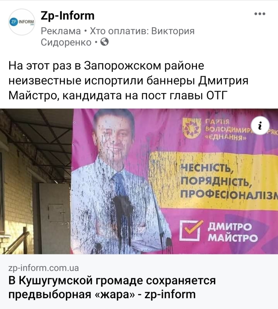 Порівняно із вересням у жовтні зросла кількість агітаційних дописів у Facebook на правах реклами. Ці матеріали не лише містять інформацію про діяльність політичних сил та кандидатів на виборах, але й доносять супутню до виборчого процесу інформацію. Так, на правах реклами розміщено допис від сайту «ZP-inform» про те, що невідомі особи пошкодили агітаційні банери кандидата на посаду голови Кушугумської територіальної громади від партії «Єднання» Дмитра Майстра. Інший рекламний допис від цього ж сайту розповідає, що за 5 років своєї депутатської каденції Дмитро Майстро придбав 6 дитячих і спортивних майданчиків для селища Кушугум та виділив кошти для закупівлі тренажерів для Будинку культури і спорту селища Балабине.