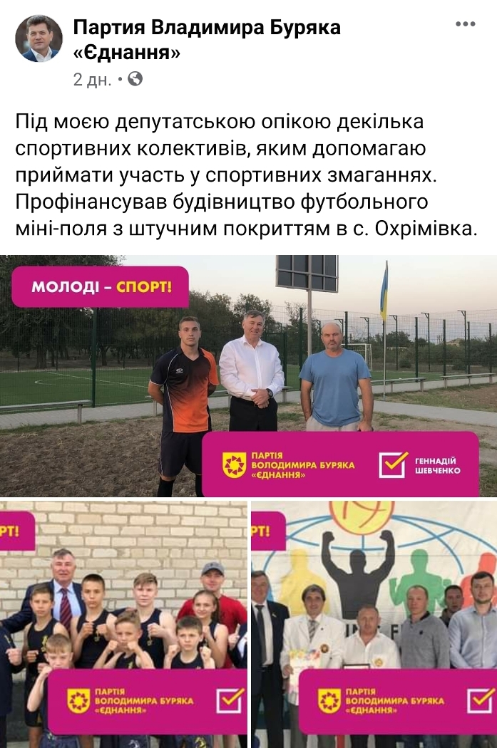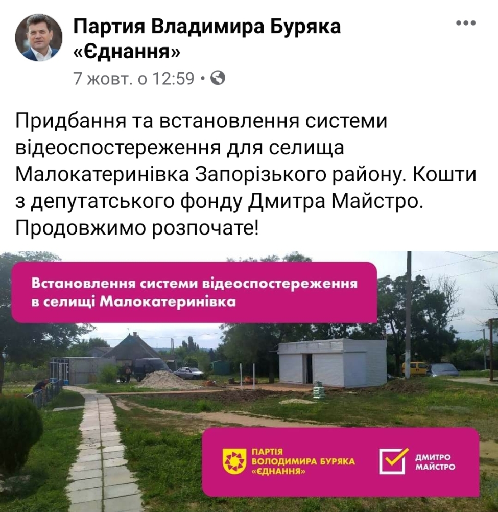 А на сторінці партії «Єднання» розповідається про придбання і встановлення системи відеоспостереження для селища Малокатеринівка. Згідно з викладеним текстом кошти на ці роботи виділено з депутатського фонду Дмитра Майстра. Інший допис тут сповіщає про фінансування будівництва міні-футбольного поля в селі Охрімівка депутатом Геннадієм Шевченком.