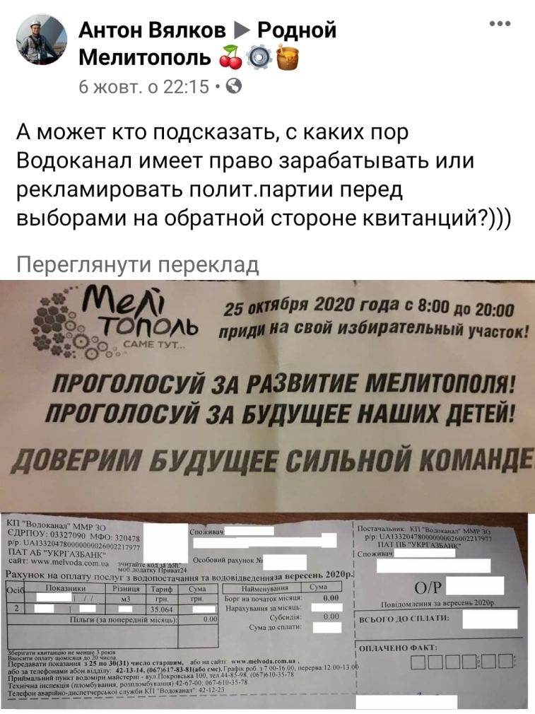 У спільноті «Рідний Мелітополь» виклали світлину, згідно з якою роздрукований рахунок від міськводоканалу містив ознаки політичної агітації.