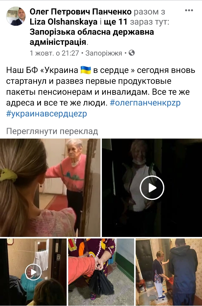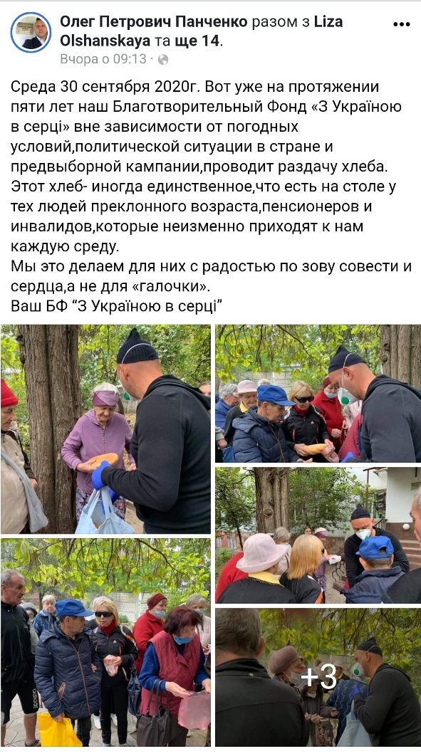 Олег Панченко, кандидат у депутати Запорізької міської ради від партії «Слуга народу» розповів 30 вересня та 1 жовтня, що він як представник благодійний фонду «Україна в серці» взяв участь у роздачі їжі пенсіонерам та людям з інвалідністю. Це відбувалося як просто неба, так і адресно.