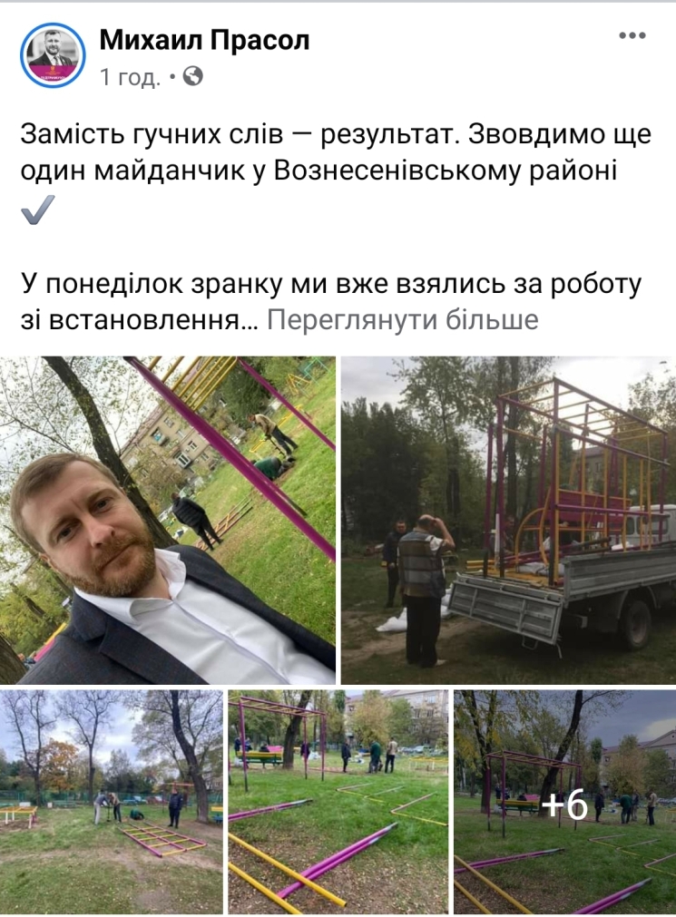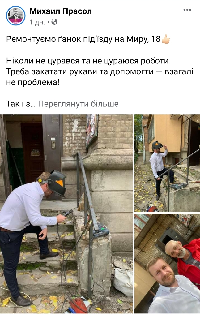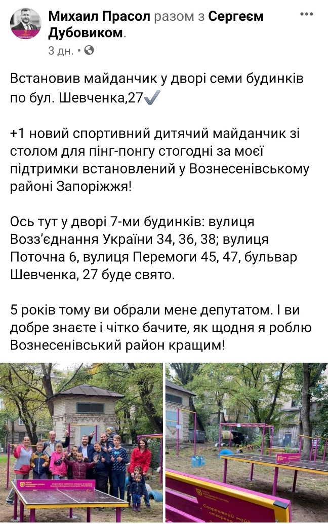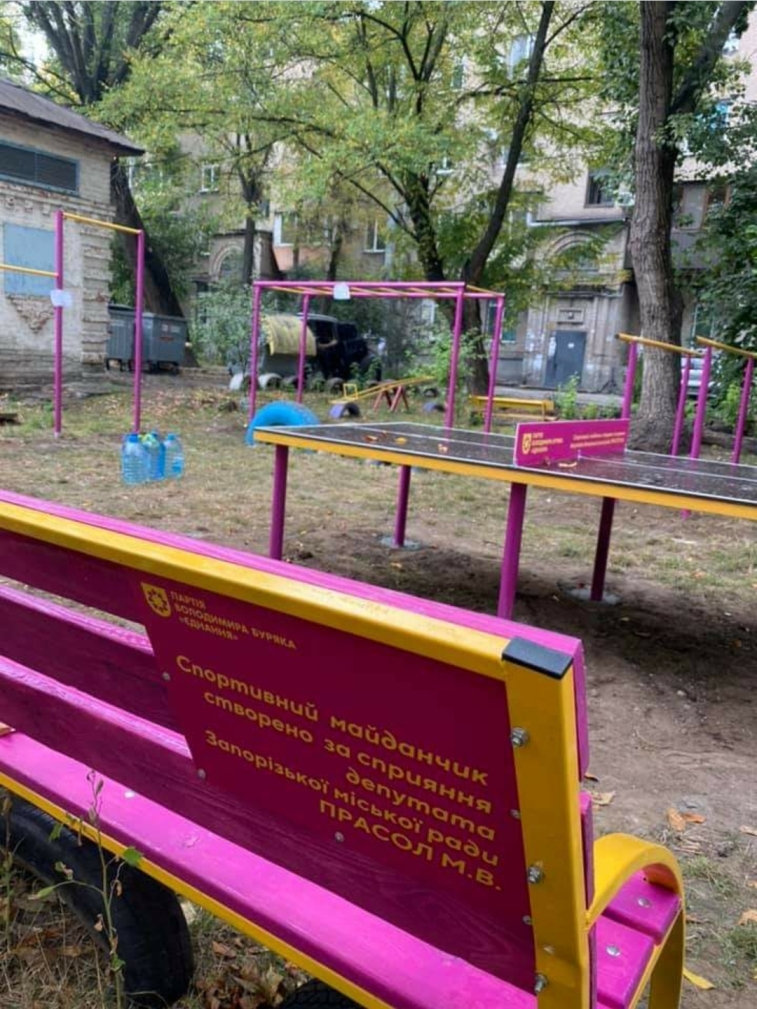 Депутат Запорізької міської ради Михайло Прасол продовжує висвітлювати свою участь у благоустрої мешканців Запоріжжя. Окремі напрямки цієї діяльності – облаштування спортивних майданчиків у дворах та ремонтування ганку і заміна вікон у житлових будинках. При цьому використовуються згадка та символіка політичної партії міського голови Володимира Буряка «Єднання».