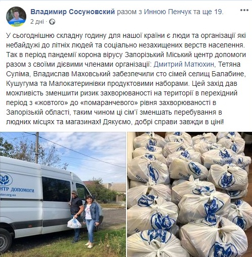 У коментарі ОПОРІ телефоном Володимир Сосуновський зазначив, що ініціатива з видачі продуктових наборів надійшла до нього від Запорізького міського центр допомоги, де і визначалися населені пункти та родини, яким надаватиметься підтримка. Дмитро Матюхін, який вказаний директором центру не фігурує на сайті ЦВК як кандидат у депутати Запорізької обласної, районної та Кушугумської селищної рад.