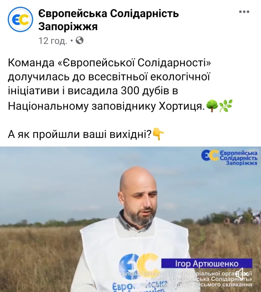Сторінка обласного осередку партії «Європейська солідарність» у відеоролику та супутньому до нього тексті розповіла про висадку на Хортиці представниками цієї політсили 300 дубів.