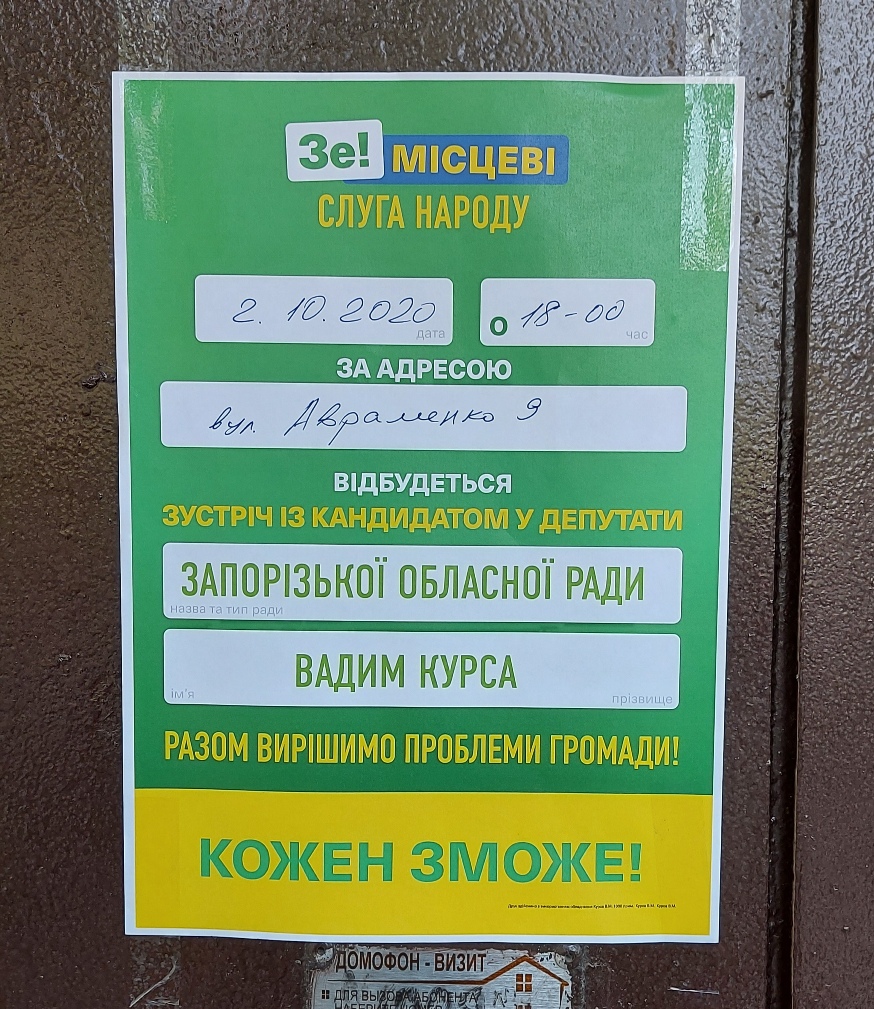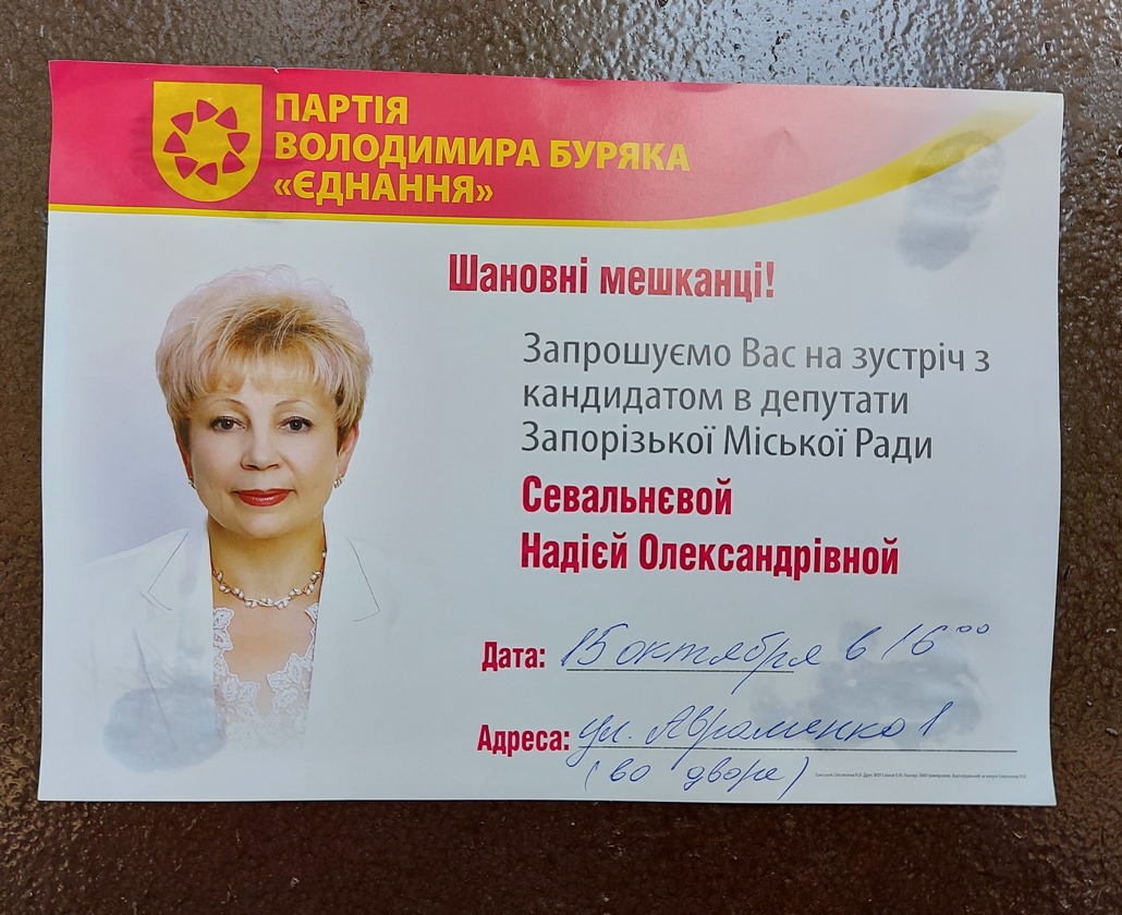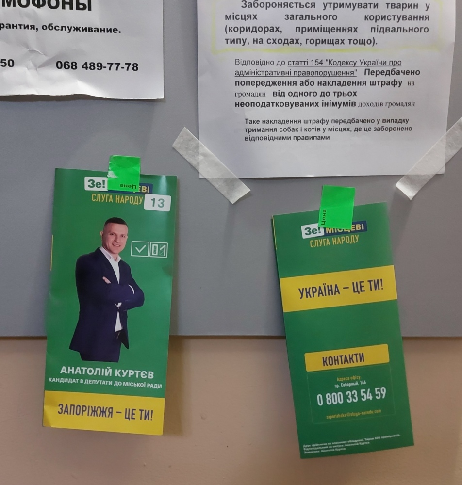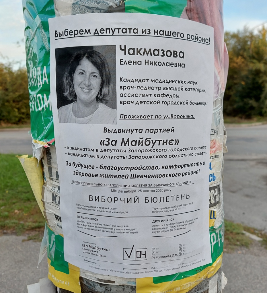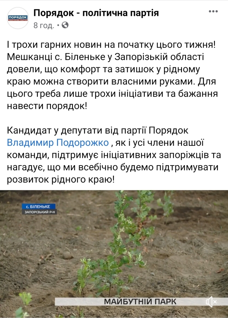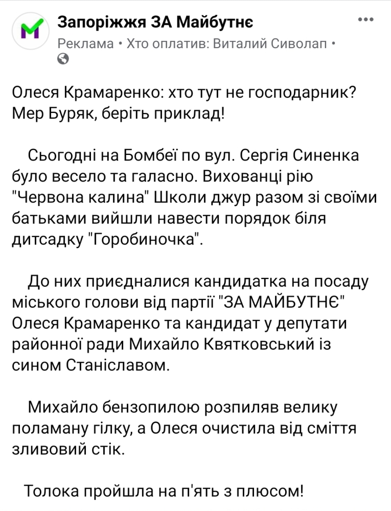 Рекламний допис повідомив про участь кандидатки на посади міської голови Запоріжжя Олесі Крамаренко та кандидата у депутати Запорізької міськради Михайла Квятковського від партії «За майбутнє» у суботнику біля дитсадка «Горбиночка».