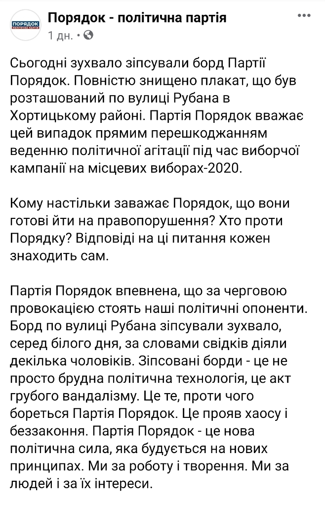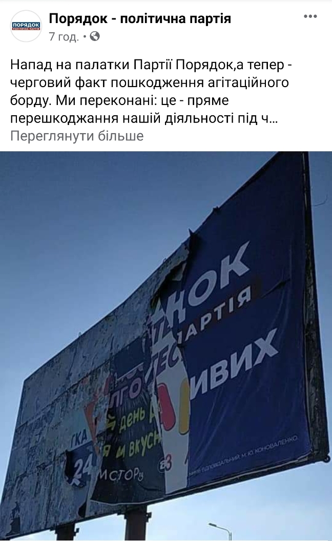 На сторінці партії «Порядок» говориться про системне нищення їхніх агітаційних бордів та наметів.