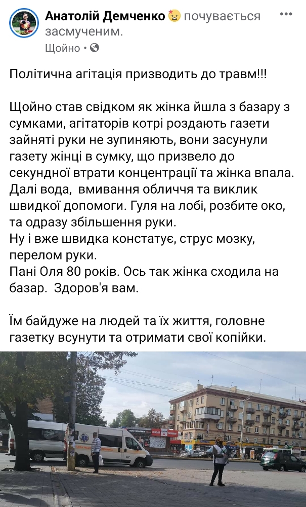Зі слів кандидата у депутати до Запорізької міськради від партії «Сила людей» Анатолія Демченка, на зупинці вул. Сталеварів агітатори за одну з політичних сил з необачності призвели до нещасного випадку з літньою жінкою.