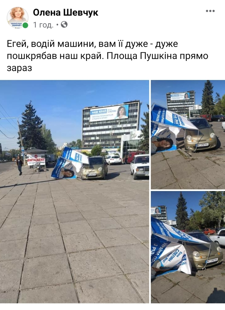 Кандидатка в депутати Запорізької міської ради від партії «Європейська Солідарність» Олена Шевченко повідомила, що на площі Пушкіна у Запоріжжі водій автівки пошкодив намет партії «Наш Край».
