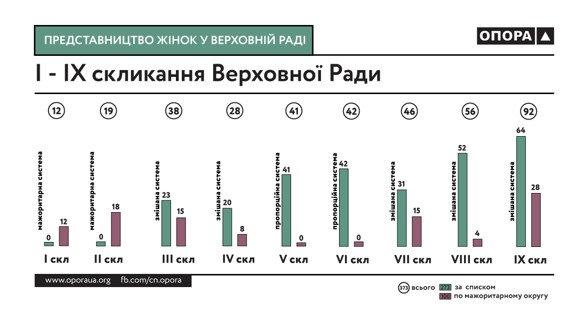 Трохи історії. Верховну Раду України І та ІІ скликання громадяни обирали за мажоритарною виборчою системою. Тоді в округах перемогли 12 та 18 жінок відповідно — 3% і 4 % депутатського корпусу. У березні 1998 року парламентські вибори пройшли вже за змішаною системою, що передбачала обрання половини депутатів за закритими партійними виборчими списками з 4%-прохідним бар’єром, а половини — в одномандатних виборчих округах в один тур. Тоді мандати отримали 38 жінок (8%) — 23 за списком і 15 в округах. У 2002 році до Верховної Ради потрапило ще менше жінок — 28. Однак за пропорційною системою жінок пройшло в кілька разів більше, ніж за мажоритарною: 20 проти 8. А ось у V та VI скликаннях Верховної Ради, обраних за партійними списками, до парламенту потрапили 41 і 42 жінки відповідно. У 2012 році Україна знову повернулася до змішаної системи. Частка жінок у Раді зросла (10% — 46 жінок), що стало об'єктивним наслідком боротьби жінок за рівні можливості у політиці. Втім, 31 депутатка пройшла за партійними списками, а лише 15 вибороли мандати в мажоритарних округах. На позачергових виборах 2014 року, які відбувалися за цією ж системою, в мажоритарних округах кандидатки жіночої статі становили лише 12,9%. У парламент потрапило 56 жінок (11,85%), з округів — лише чотири: Ірина Констанкевич (Волинь), Тетяна Ричкова (Дніпропетровщина), Ірина Подоляк та Оксана Юринець (обоє обрані на Львівщині).