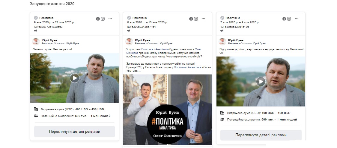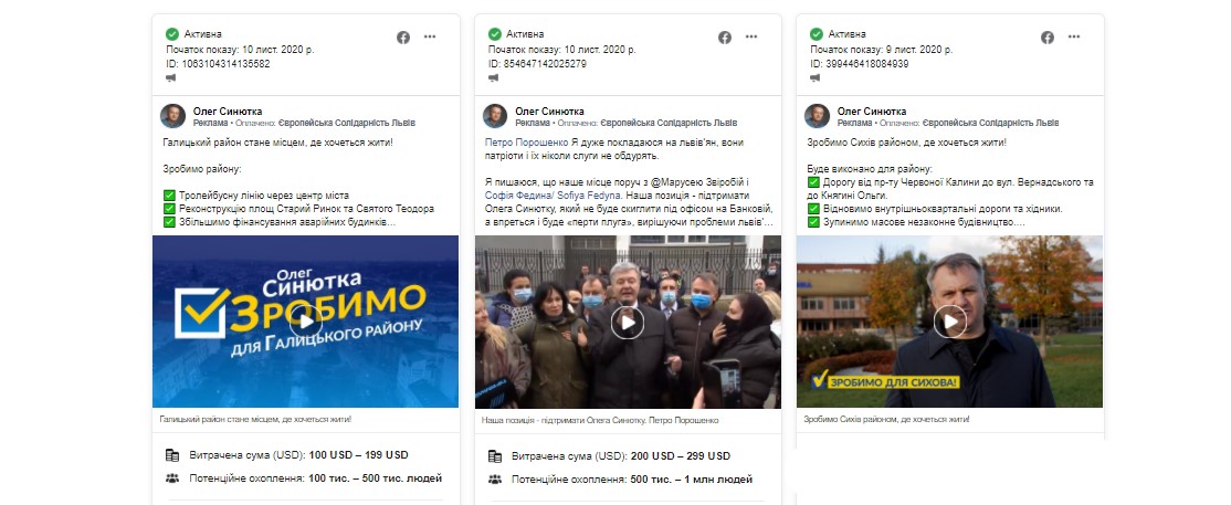 Зауважимо, що попри відкритий рахунок власного виборчого фонду кандидата Олега Синютки, політична сила з 3 по 10 листопада продовжила оплачувати рекламні пости у соціальній мережі Facebook на публічній сторінці Олега Синютки. За 15 дописів “Європейська Солідарність” заплатити від 815 до 2385 доларів.