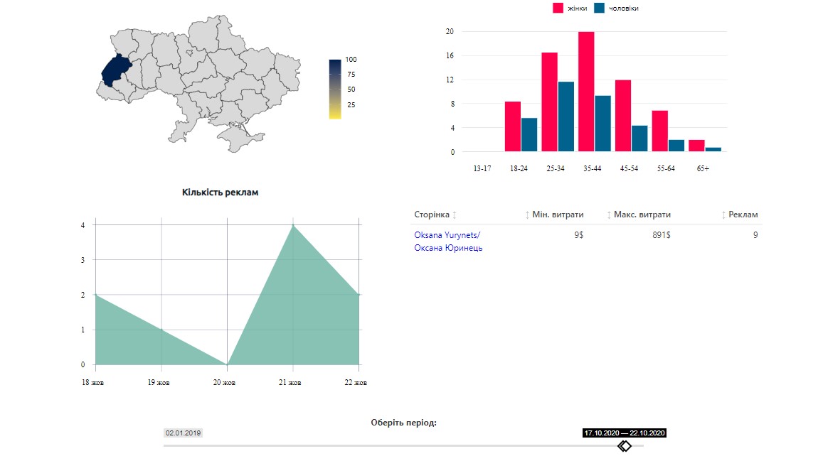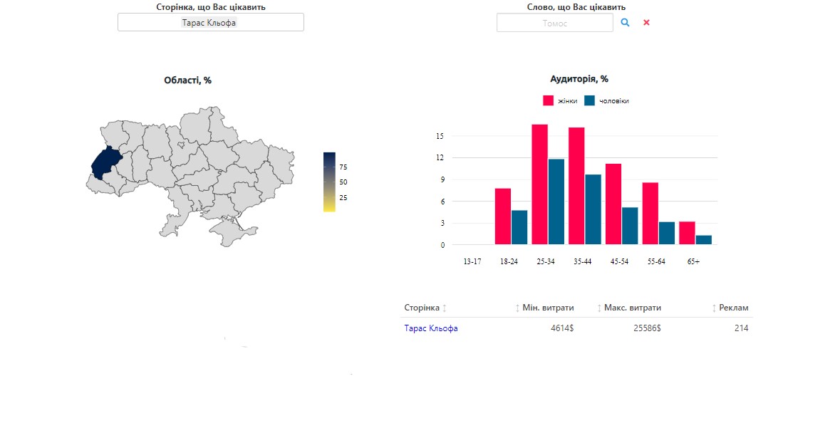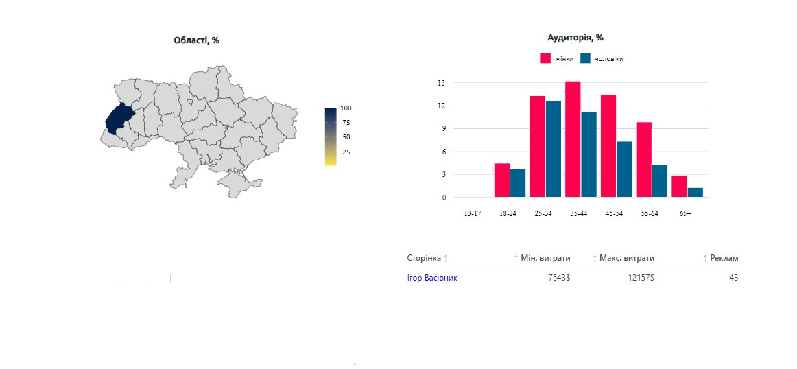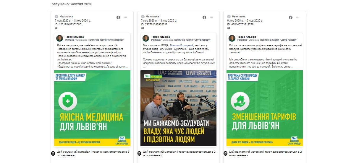 Немає у документі Кльофи витрат на рекламу у соціальних мережах, але вона була. Рекламні пости оплачувала партія. А це 214 рекламних дописів на суму від 4 614 до 25 586 доларів.